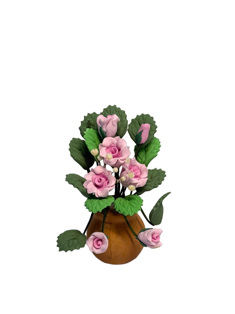 整束花的构图藏着自然生长的韵律。三朵盛开的玫瑰呈三角形分布,最高的一朵昂首向上,花瓣舒展得最为奔放;旁边两朵略低,一朵微微侧倾,仿佛在与同伴低语;三朵花苞则穿插在花丛间隙,有的躲在叶片后方只露出半颗脑袋,有的从花茎侧面探出头来,形成“犹抱琵琶半遮面”的娇羞感。白色的小米粒状花朵点缀在空隙处,如星子般打破绿色的厚重,花茎以细铁丝为骨,表面裹着绿色粘土,有的笔直挺拔,有的微微弯曲,甚至有一根花茎在中部自然扭转,模拟了植物为争夺阳光而产生的趋光性生长。深棕陶土花盆表面有细微的磨砂质感,边缘被捏出不规则的波浪形,仿佛手工拉坯时留下的痕迹,与花丛的精致形成粗粝与细腻的奇妙碰撞。